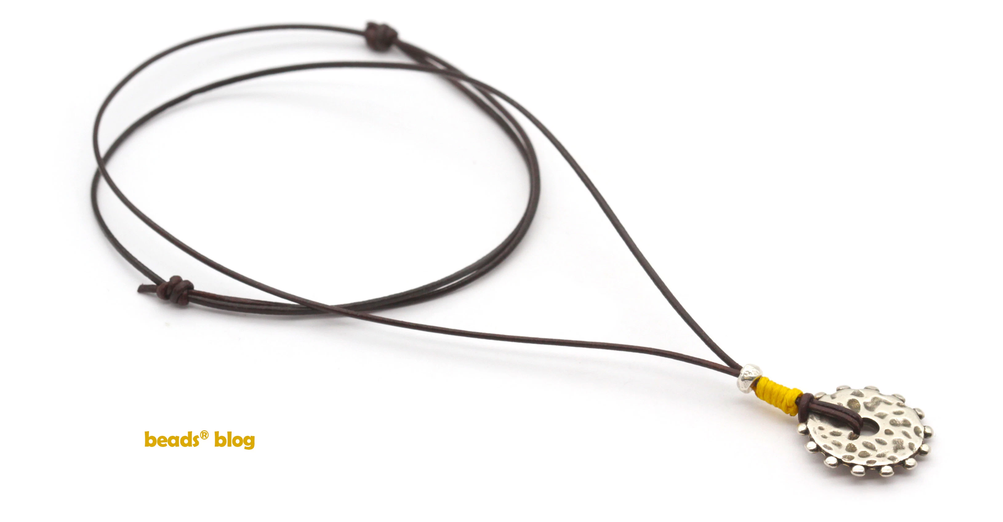Para fazer o nó à volta do fio de cabedal, e dar uma cor a estas peças, usámos o fio encerado de 1mm (ver aqui o nó).